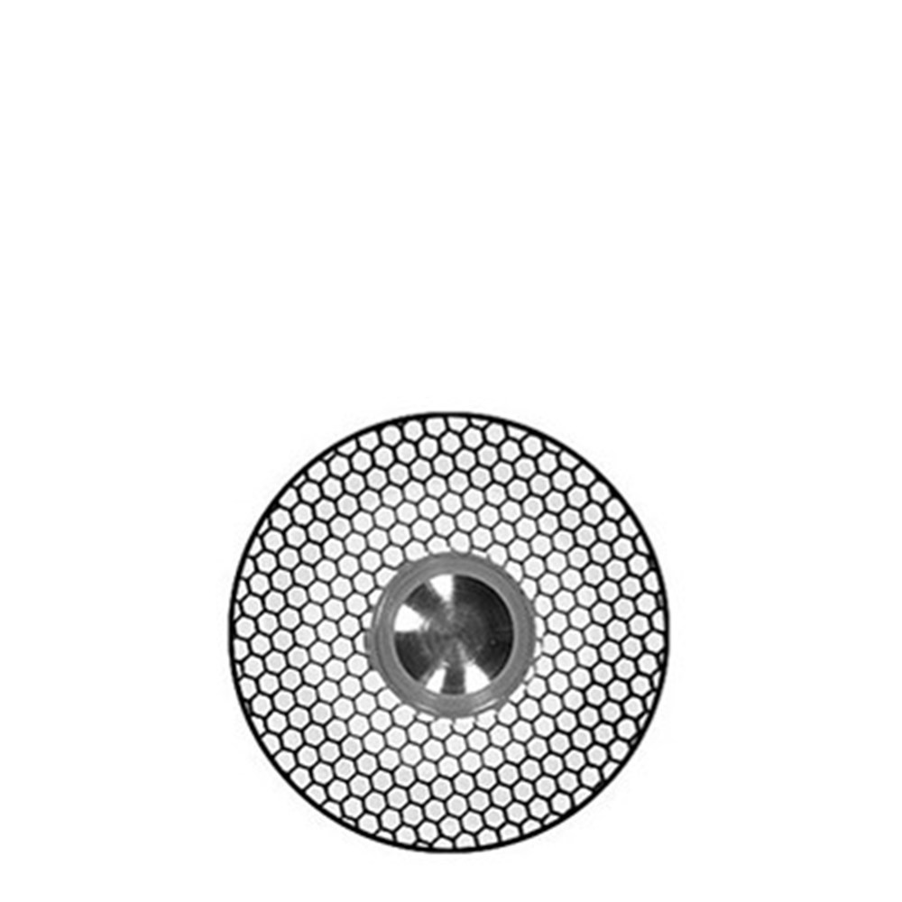 Honeycomb design medium grit diamond disc for ullta fine contouring of ceramics / acrylics. Mounted HP 104, 18mm diameter with 3 mm coating