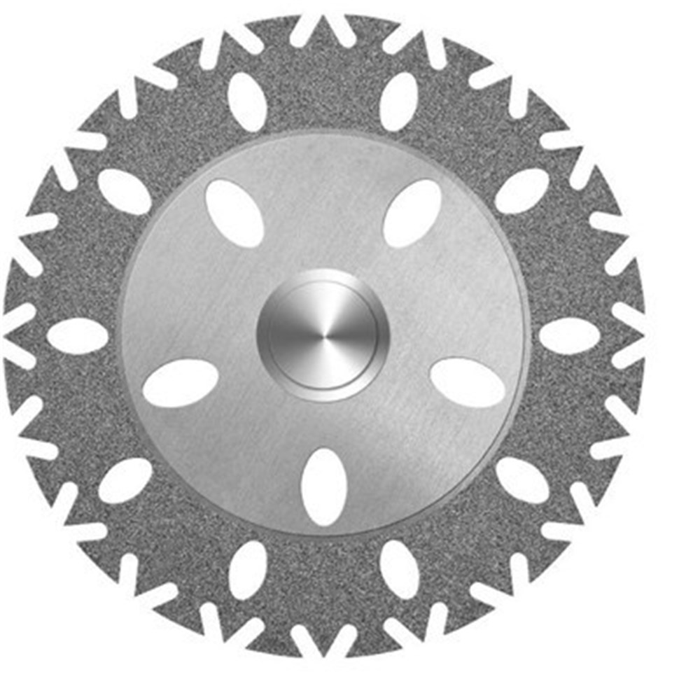 Serrated double sides diamond disc for plaster or acrylic models. Suitable for clockwise and anticlockwise rotation. Mounted HP 104, with 48mm diameter with 9mm coating.