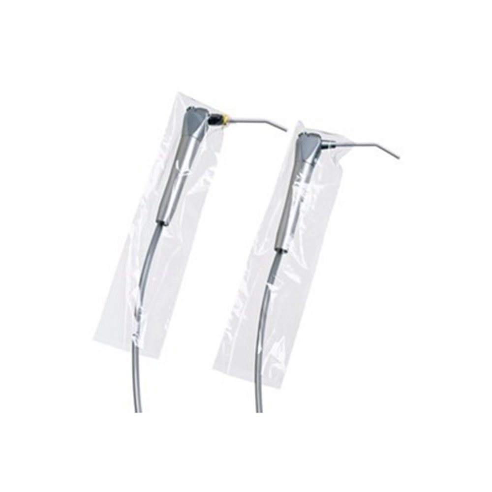 For covering of air water syringe, HVE and saliva ejector valves. Unique tape strip fastens bag to tubing to prevent sliding