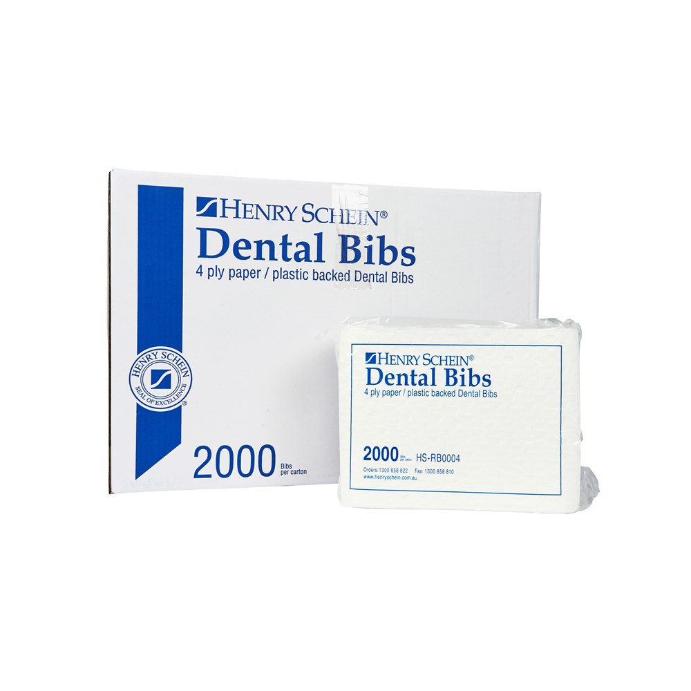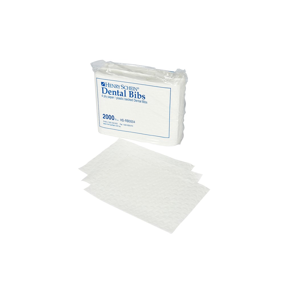 A quality dental bib with 4 ply paper and a plastic backing 27cm x 20cm - 8 packs of 250 per carton