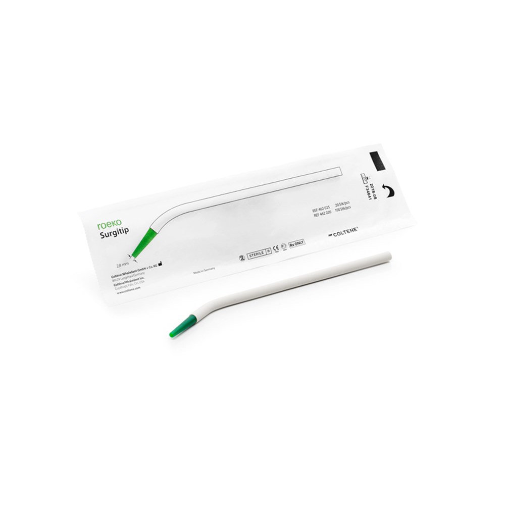 Surgitip aspirator tips are proven aids in drying the oral field of treatment in minimally invasive surgery and in aspirating particles. The plastic aspirator tips allow extremely accurate aspiration as the shape and design have been specially developed for working under a microscope or loupe. The tips are ideal because of their hygienic handling and ease of use.