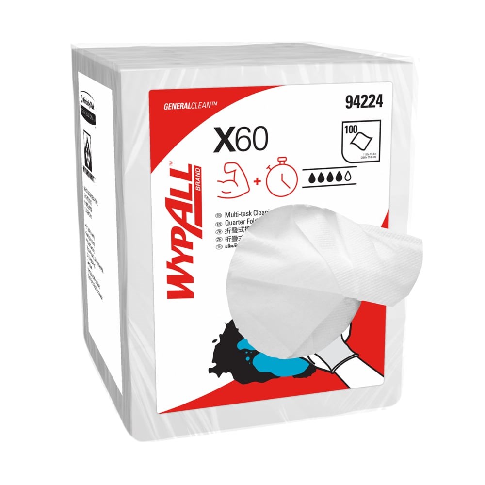 From wiping up grime, oil and grease to soaking up food prep spills, having the right wipe on hand is crucial to your operation. A clean and absorbent alternative to paper towels, rags and shop towels, WYPALL® offers a wide range of task-specific wipes and cloths designed to meet your industry, budget and absorbency needs.WYPALL® X60 Single sheet Wipers deliver the absorbancy of Hydroknit™ technology in lightweight, versatile dry cleaning wipes for multi-purpose use around the workplace. These strong cleaning cloths are suitable for general cleaning tasks and are absorbent for wiping a variety of surfaces. Soft and gentle in texture means they are also suitable for wiping delicate surfaces. WYPALL® X60 cleaning wipes can be used to effectively absorb spills, apply liquid-based products and polish stainless steel and glass. These cleaning cloths can also scrub off adhesives and remove oil and debris. The flexible nature of WypAll® X60 single sheet wipers makes them suitable for precision cleaning and cleaning tight corners on machinery.WYPALL® X60 single sheet wipers dispense one wiper at a time ensuring the user touches only the wiper they use promoting good hygiene in the workplace. The portable, self-dispensing poly bag allows for easy transport and helps to protect the cloths from contamination. Each case of WYPALL® X60 single sheet wipers contains 8 packs, each containing 100 white cleaning cloths.Always read the label.Follow the instructions for use.
