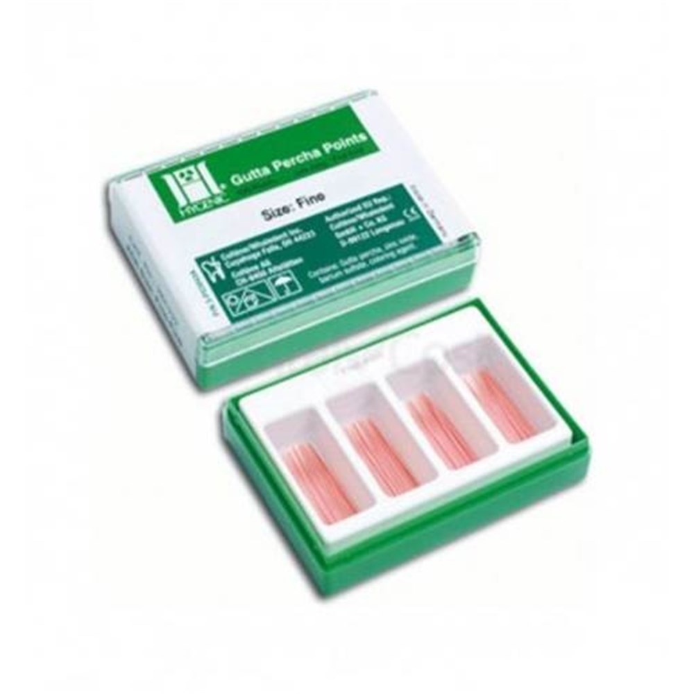 The Guttapercha Points are available in different ISO sizes, different tapers and with a top color coding, full color coding or in pink. Also conventional sizes are available to offer the dentist more options for various condensation techniques.