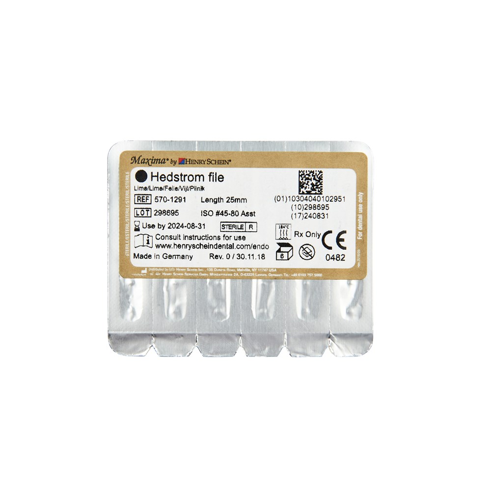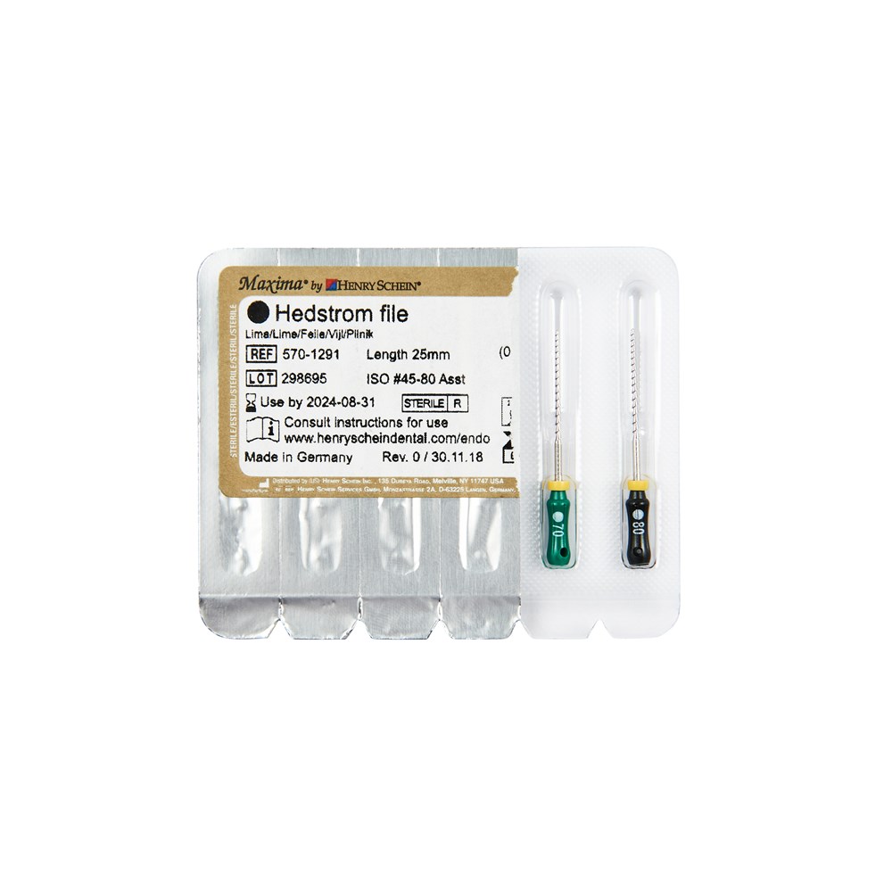 MAXIMA sterile hedstrom files in easy to open blisterpack to assure sterility when using a new file. Made in Germany these handfiles are of high quality steel for effective shaping the endo canal. The handle has the “hourglass” shape to assure maximum manoeuvrability and limit finger fatigue. The handles are ISO colored and have an endo stopper.