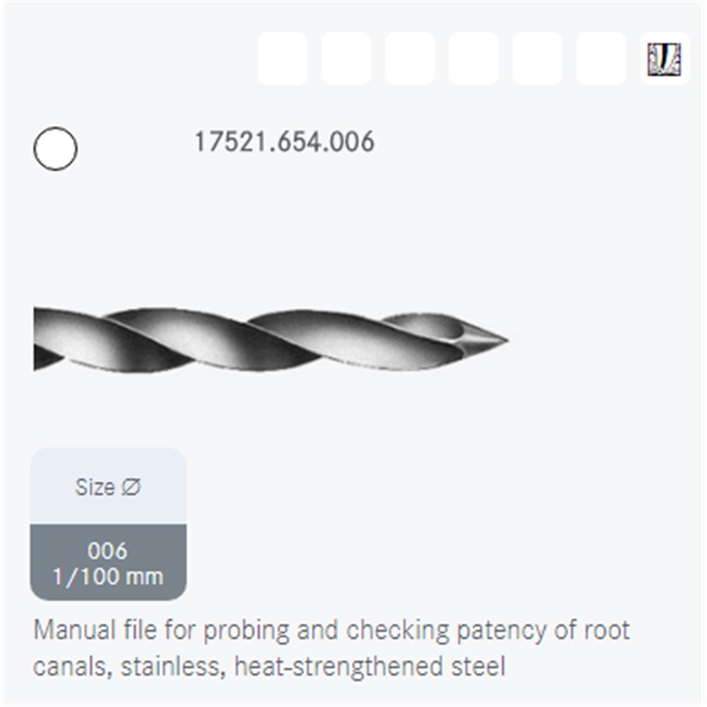 Manual file for probing and checking patency of the root canal. Stainless, heat-strengthened steel. Size 006, 21mm, sterile Pk of 6 Short Plastic Handle