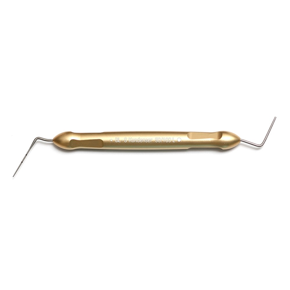 BL Kondensers are available individually or in a full set of 4 condensers. One end is made of nickel titanium, can be used for treatment in curved canals. The other end ,flat and made of stainless steel, is ideal for compaction in the coronal and middle thirds of canal. Handles are colour coded for quick identification.