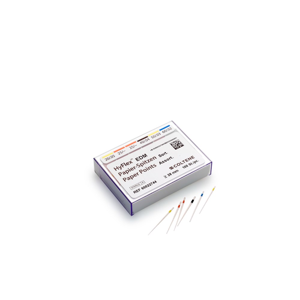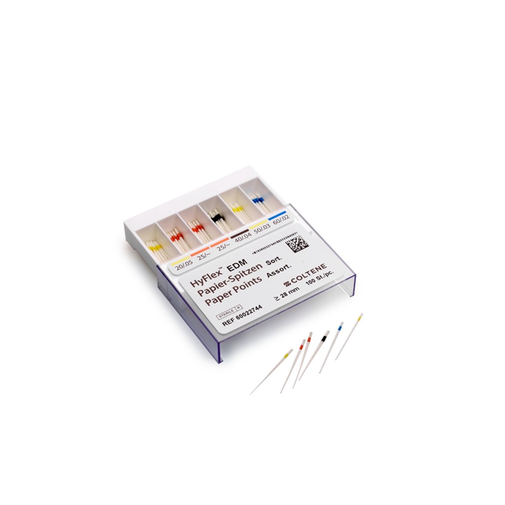 HyFlex EDM paper points are ideal for drying root canals which have been prepared with HyFlex EDM files. At the tip of the point the diameter corresponds to the ISO sizes, but then the conicity follows the one from the EDM files.