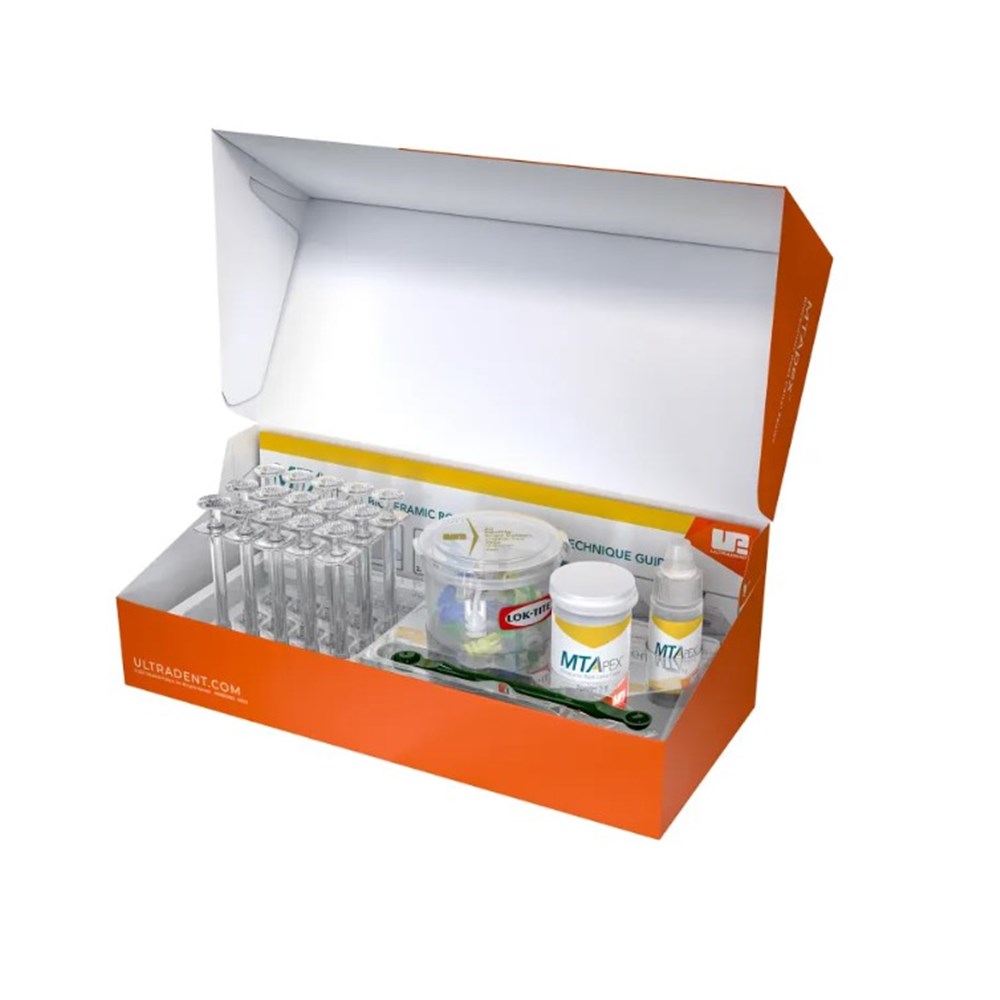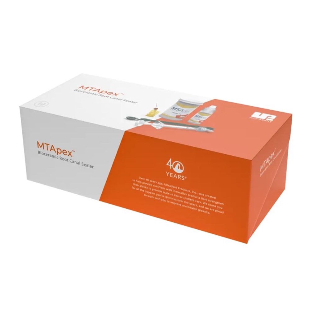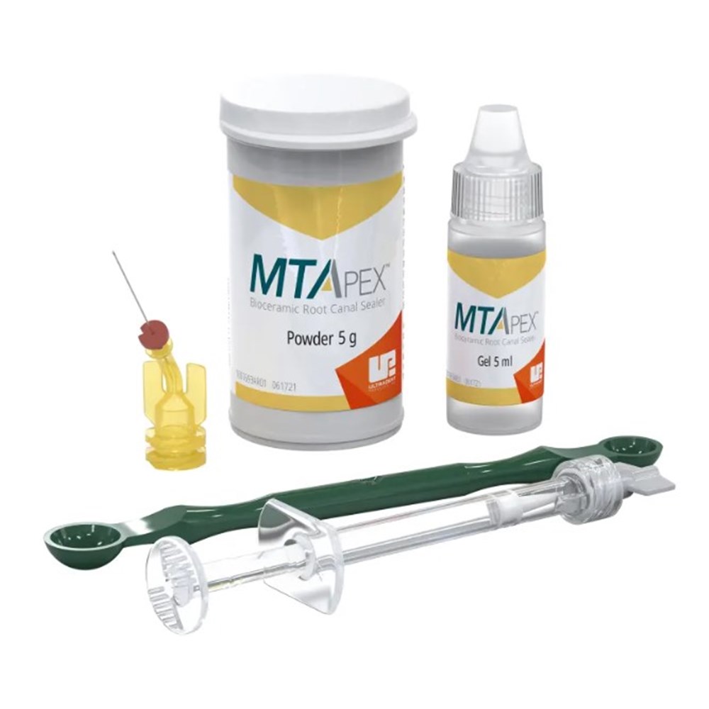 MTApex™ bioceramic root canal sealer fills and coats the wall of the root canals (sealing against coronal and apical leakage). The proprietary gel and tricalcium/dicalcium silicate powder mixture releases calcium ions. This stimulates bone repair and increases the pH of the canal to help avoid bacterial growth and root resorption. Deliverable via a NaviTip™ 29 ga single sideport tip or gutta percha, one MTApex bioceramic root canal sealer kit contains enough powder and gel to seal approximately twenty canals.