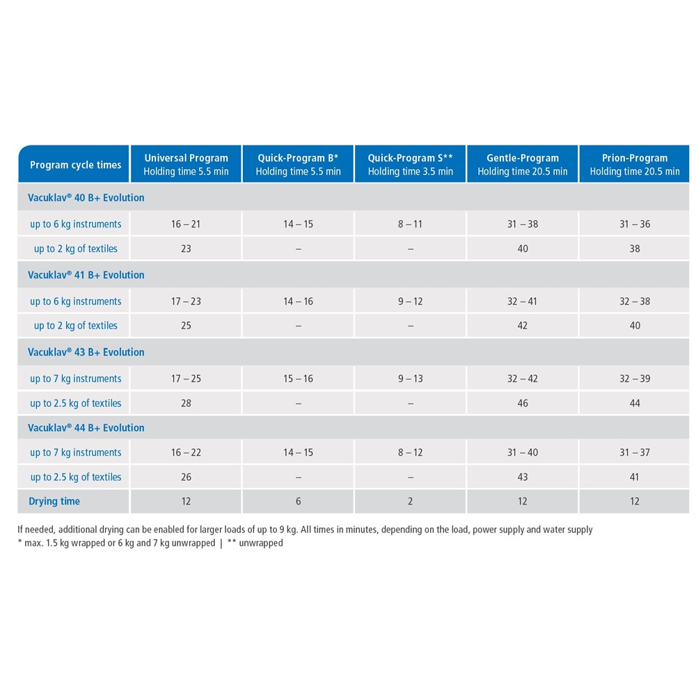- Patented double-jacket technology: Record-breaking operating times of 10 – 20 minutes (Quick-Programs incl. pre-vacuum and drying) guarantee even faster instrument availability.