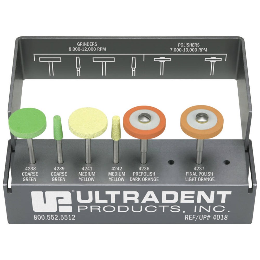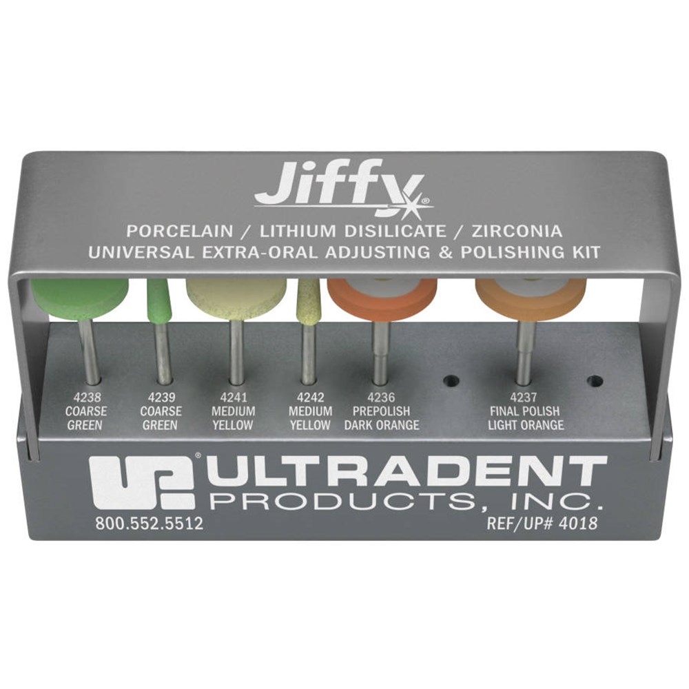 Ultradent’s Jiffy Universal System is a finishing system for all ceramics, including high-strength ceramics. All of the adjusters and polishers in the Jiffy Universal System work interchangeably on porcelain, lithium disilicate, and zirconia. The Universal Extraoral Adjusting and Polishing Kit and the Jiffy Universal Intraoral Adjusting and Polishing Kit contain an optimal number of components so you can efficiently adjust and polish any ceramic material to achieve a truly smooth surface with a natural-looking finish.