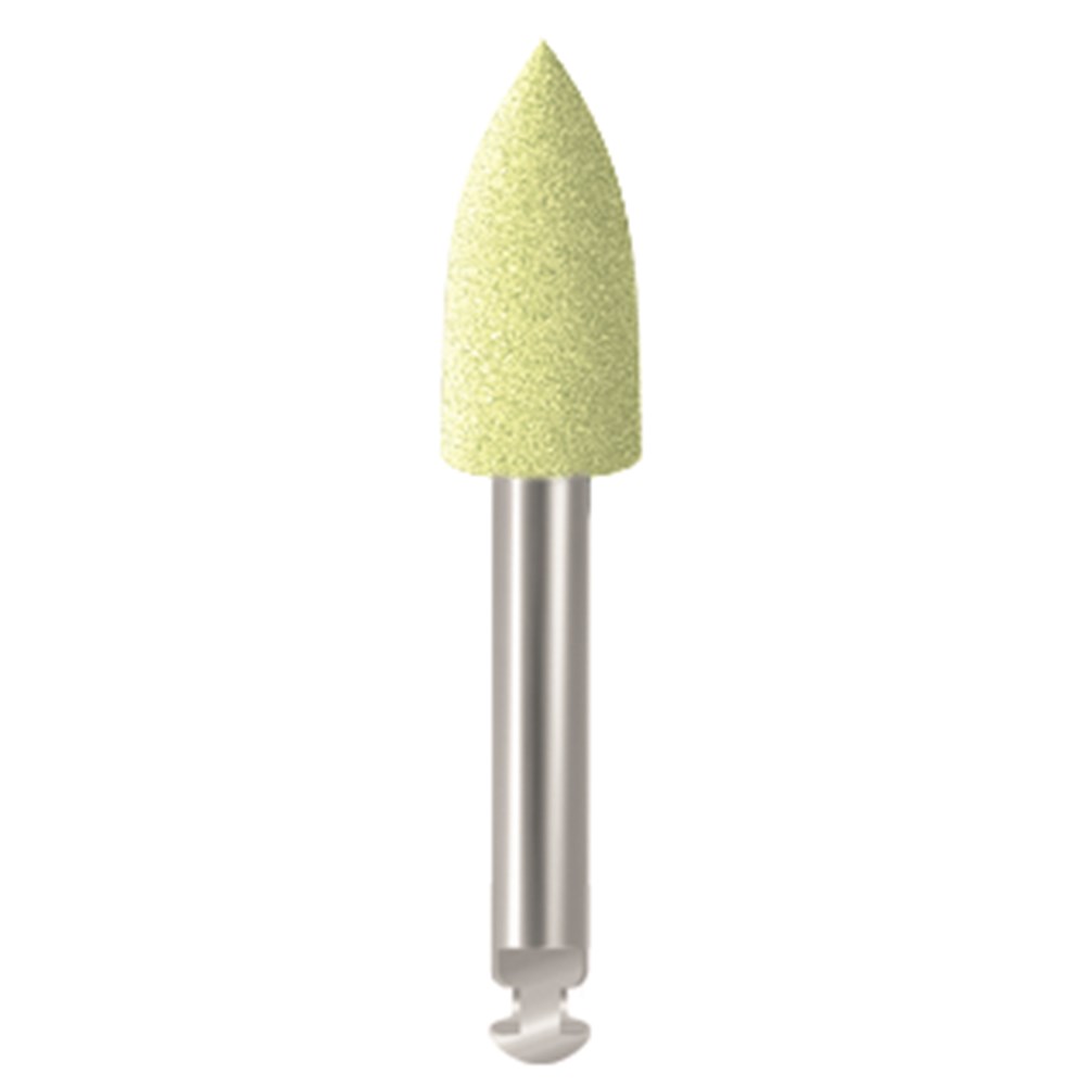 Two-step diamond polishing system for composites. The first step uses Medium polishers for finishing and contouring. The second and final step uses Diamond coated polishers for a high-luster finish. Metal shank (RA). Refill Box of 12.