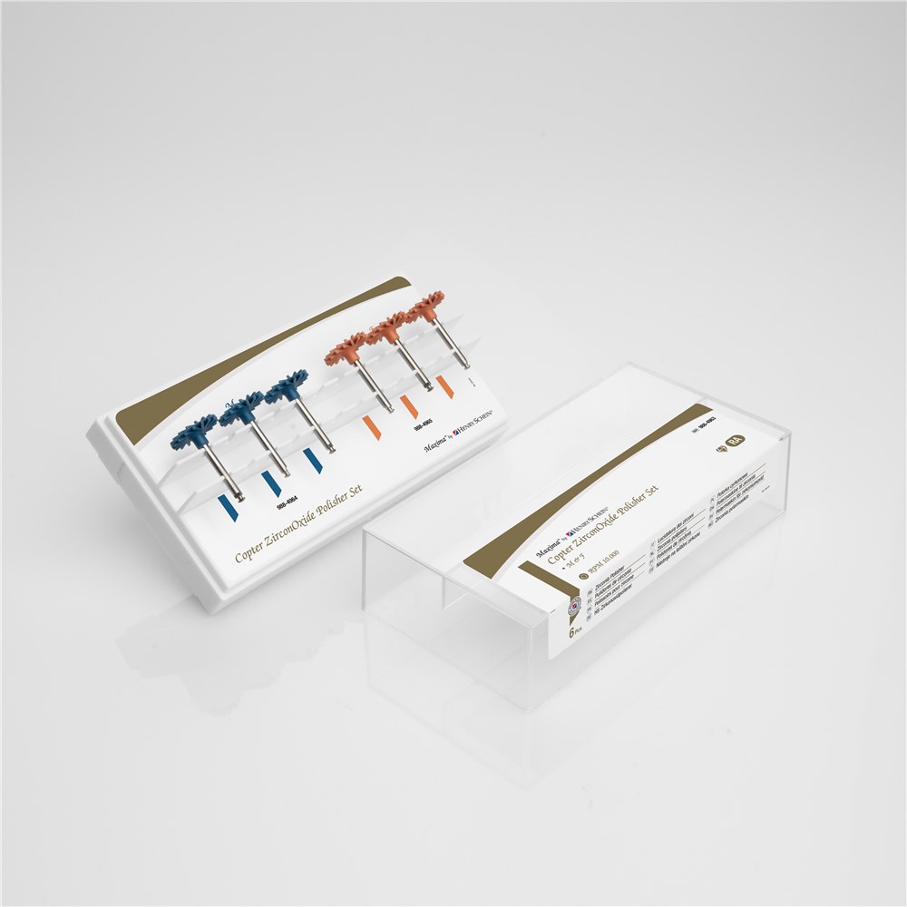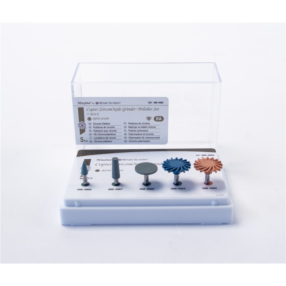 - Complete set for intra-oral adjustments and polishing of zirconia restorations.