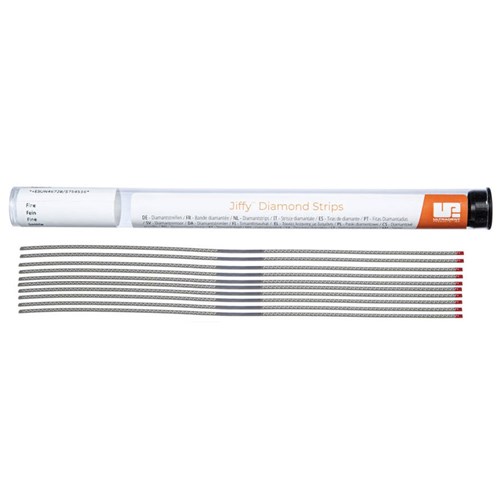 Jiffy strips and saws are made of stainless steel to resist breaking, offer a perforated design to assist in debris removal, and are thin and flexible to provide an optimal finish. They are autoclavable and have a diamond-free zone for easy insertion between teeth.
