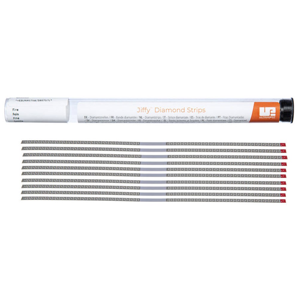 Jiffy strips and saws are made of stainless steel to resist breaking, offer a perforated design to assist in debris removal, and are thin and flexible to provide an optimal finish. They are autoclavable and have a diamond-free zone for easy insertion between teeth.