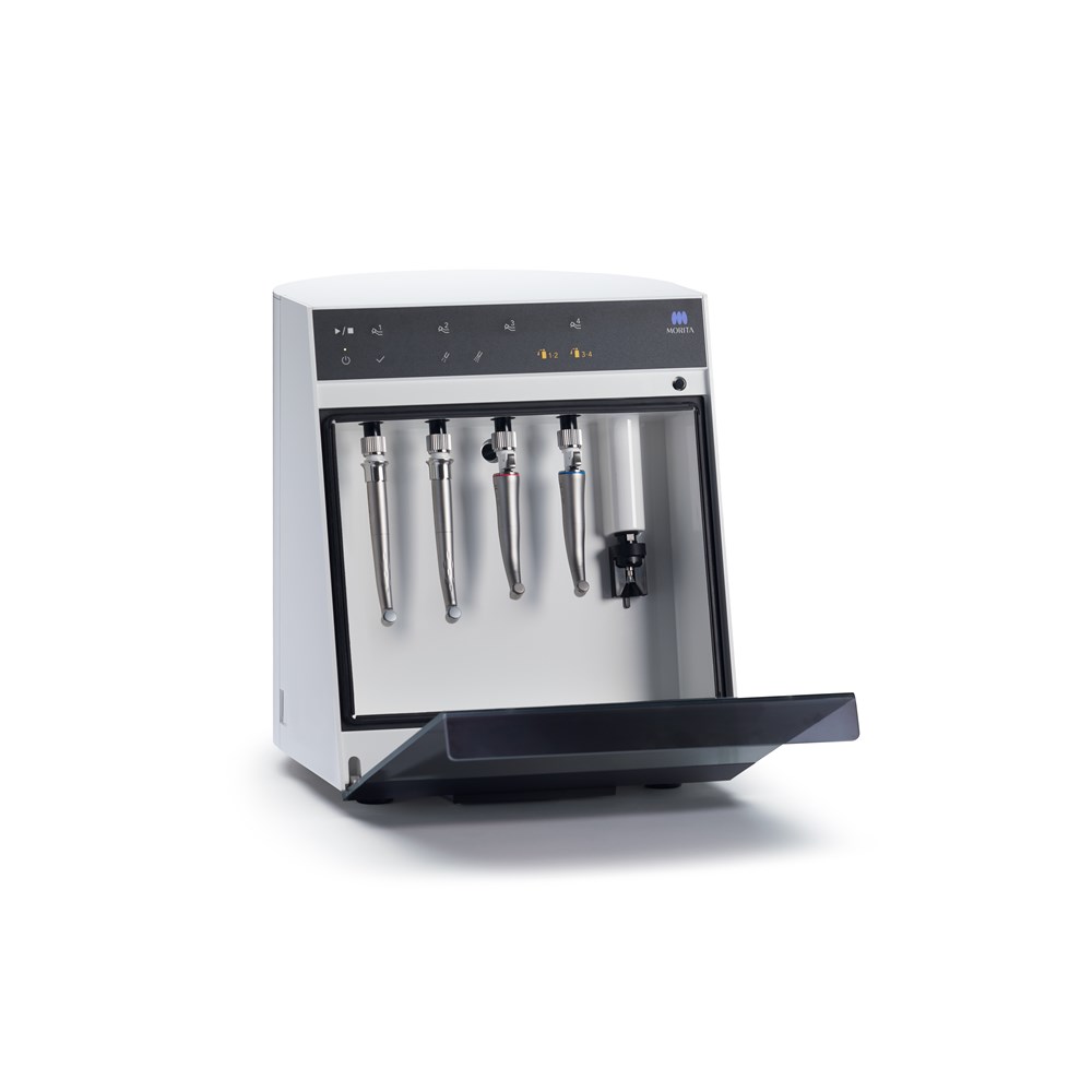 Lubrina 2 automatically performs maintenance (lubrication and cleaning) of handpieces which are essential for daily practice. Because the lubrication amount and service time suitable for each handpiece are programmed into Lubrina 2, it can automatically perform maintenance of up to four handpieces in a short time. The clean air-blow system implements lubrication and cleaning of the inside of the handpiece thoroughly, and provides stable maintenance without variations by staff which can occur during manual lubrication. Lubrina 2 accepts multiple brands of spray lubricant.