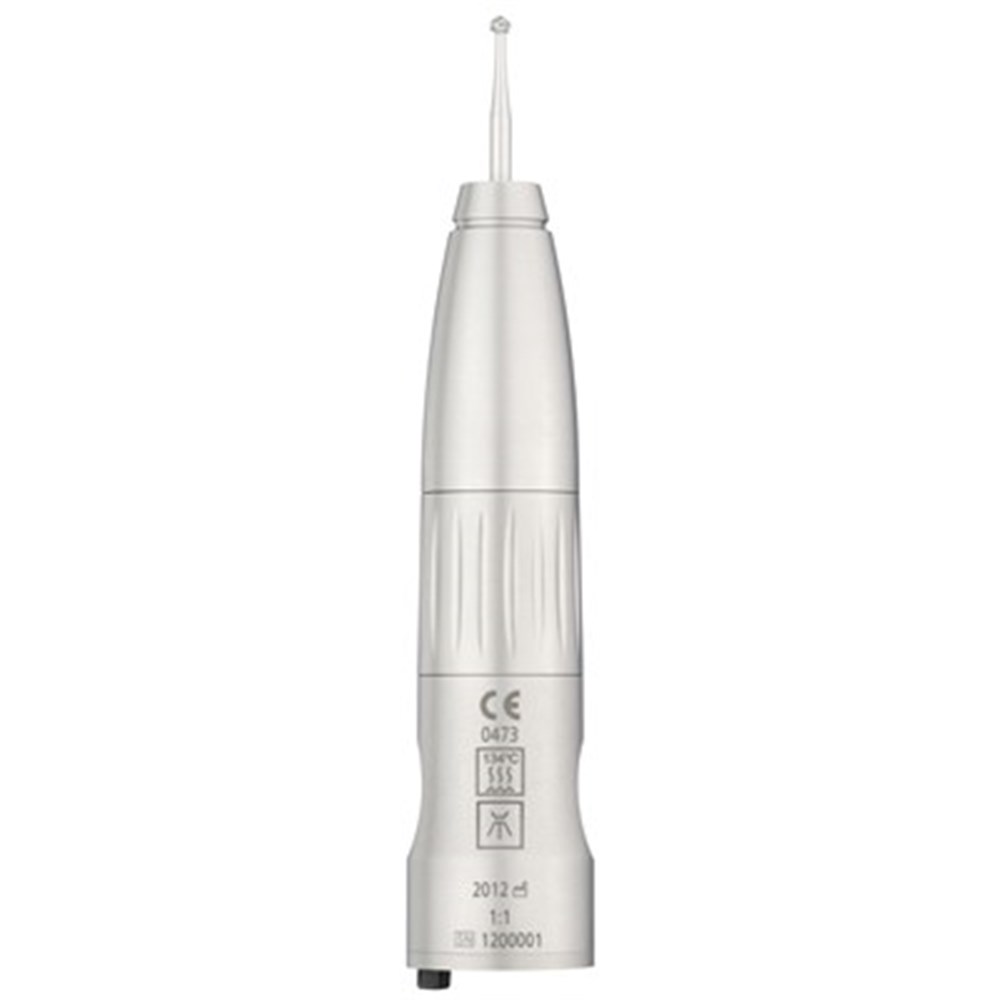Direct ratio 1:1 straight handpiece without light, internal spray, stainless steel body, standard ‘E’ fitting connection, suitable for thermodisinfectors and autoclaves.