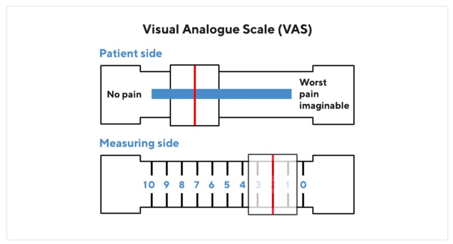 A small ruler on which patients are asked to indicate their pain intensity by moving a cursor from one end to the other. The back of the ruler, designed for the assessor, has a scale from 0 to 10 (or 0 to 100 mm). However, just because two patients rate their pain between 7 and 10 does not mean that they will experience the same intensity. This assessment must be accompanied by a dialogue between the carer and patient.