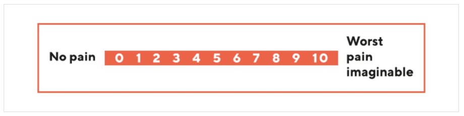 The healthcare provider asks the patient to self-assess the current level of pain by circling the number from 0 to 10 that best describes their level of pain. A score of 0 is "no pain." A score of 10 is the "worst pain imaginable."