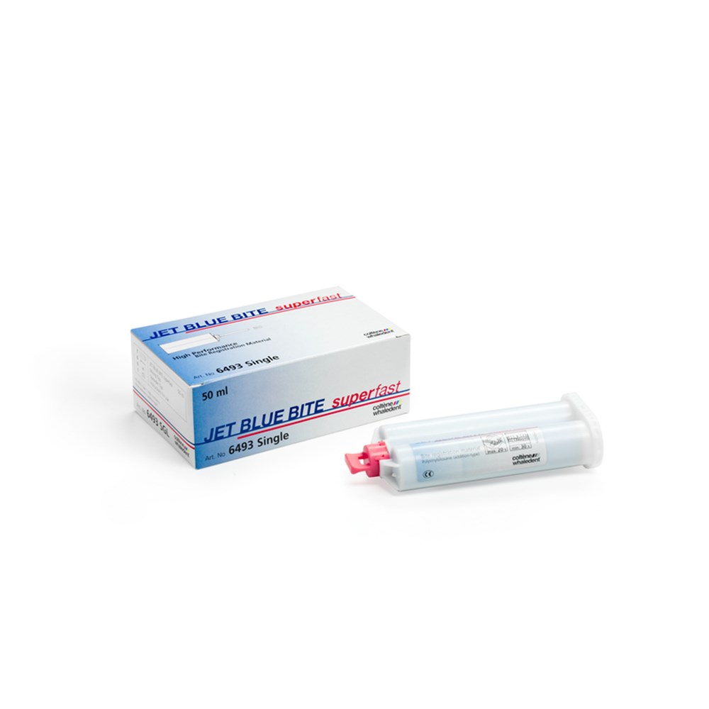 Jet Blue Bite bite registration material flows with a smooth whipped-cream consistency exactly where you want it in a predictable quantity and ideal ribbon pattern. It offers a fast oral setting-time and sets rock hard for greater accuracy but is still flexible enough for easy trimming or cutting. The superior handling characteristics are the key for a perfect occlusal fit on the first try.