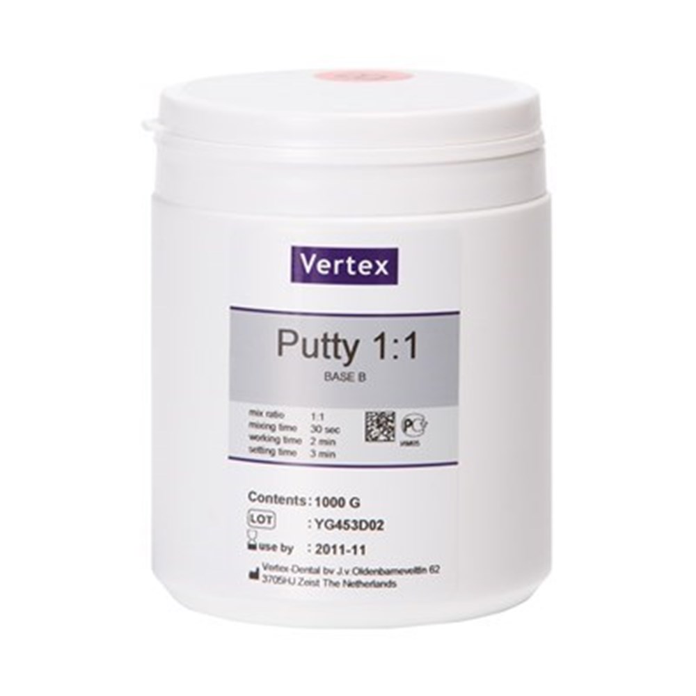 Vertex™ Putty 1:1 with a Shore A value of 85 after setting. Putty 1:1 is suitable for moulds, fixing keys, provisional models etc. Putty 1:1 is form stable, heat resistant till 300 degrees Celsius and gives an excellent reproduction of details.