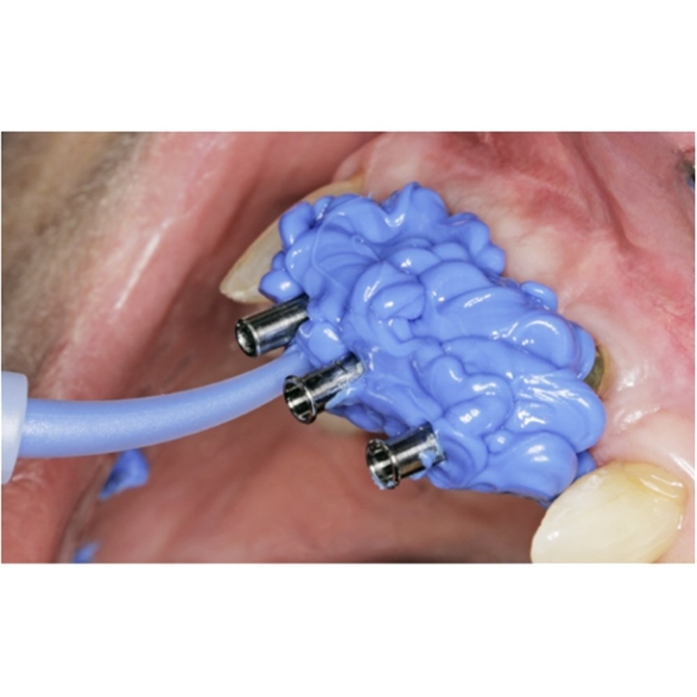 Honigum Pro Heavy is also ideally suited to taking implant impressions. Thanks to its unique structure, the material flows particularly well around the impression posts and transfer caps – but nevertheless reliably remains at the application site.