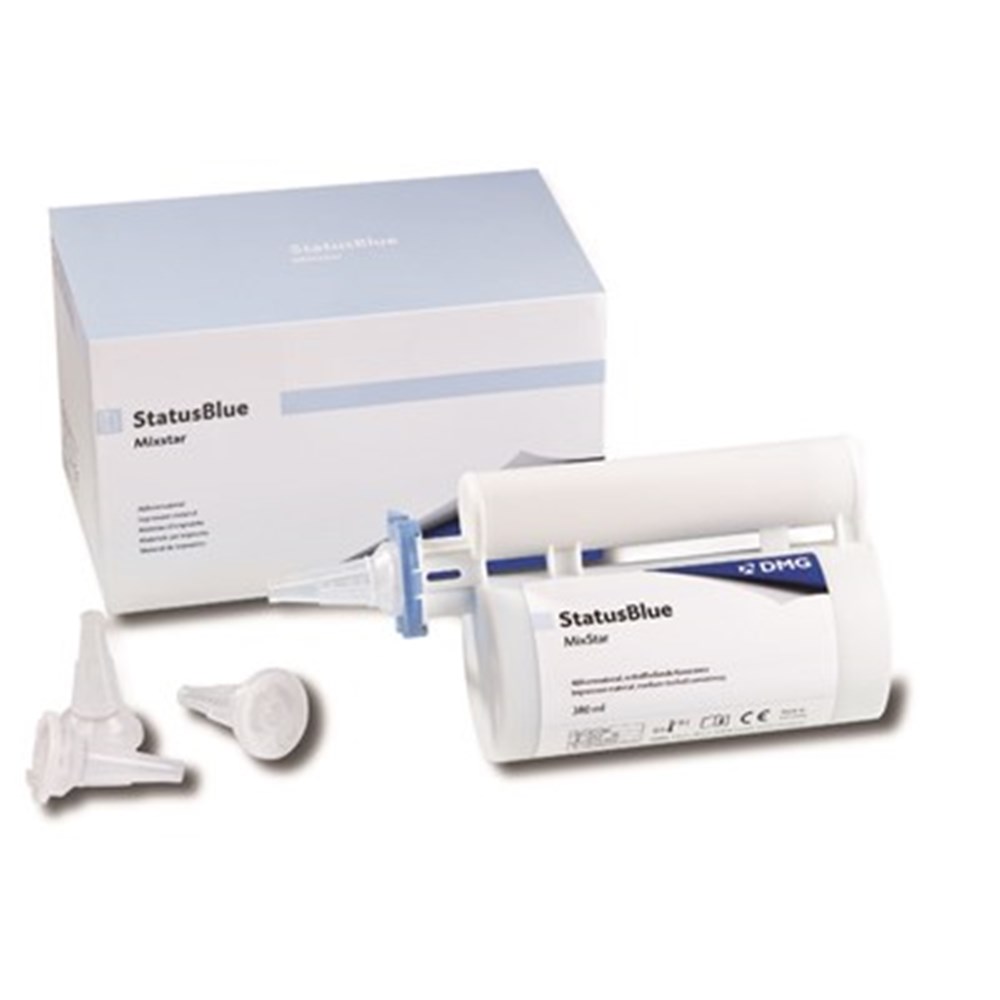 While alginates still require time-consuming hand-mixing StatusBlue is mixed quickly, automatically, and precisely in either the 50 ml or 380 ml cartridge. And the homogeneous, dust and bubble-free direct application of the material into the tray ensures precise and clean processing. StatusBlue in the 50 ml Automix cartridge can be used in the same delivery system as Luxatemp (DMG) to ease the treatment process and daily practice routines.