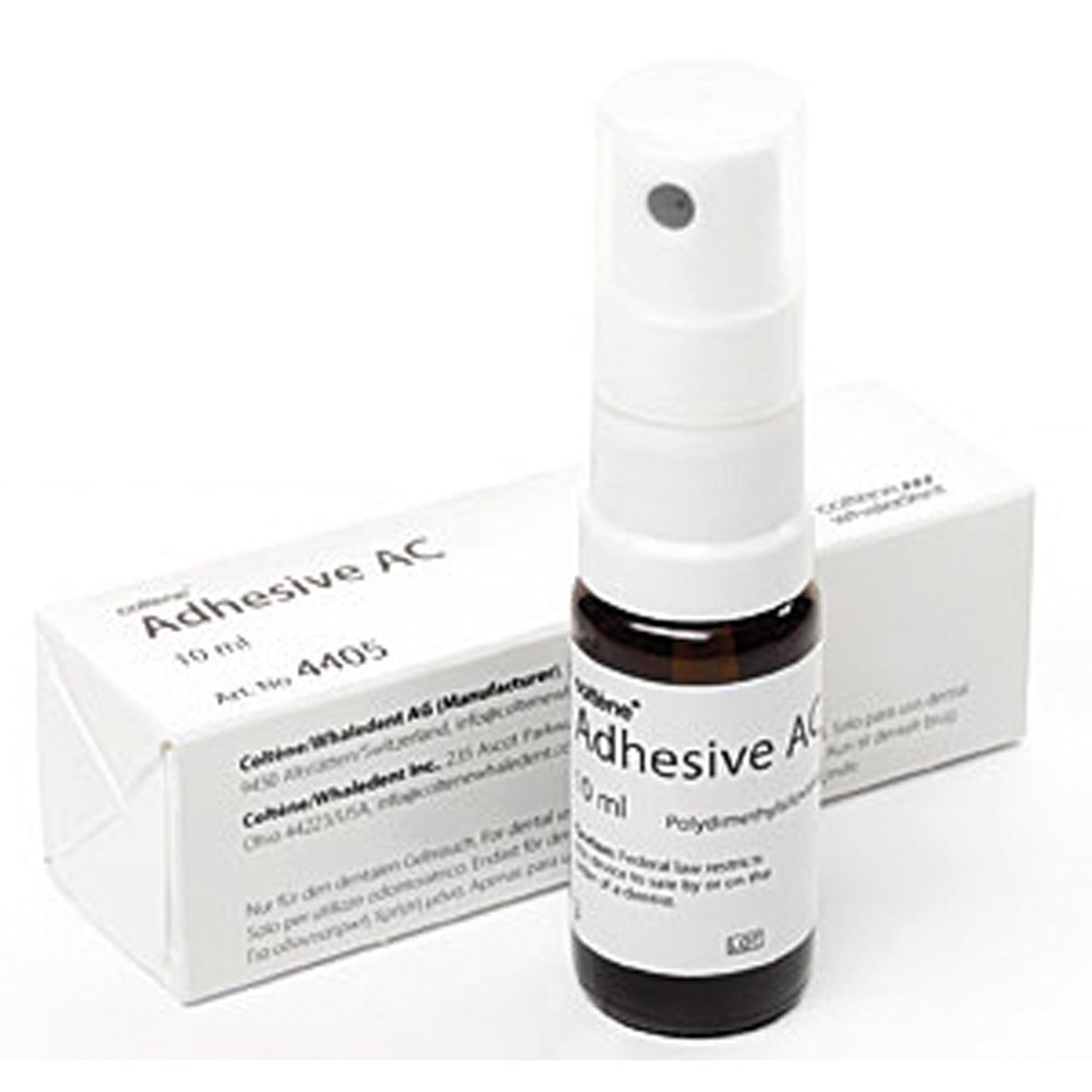 Coltène Adhesive is an autoclavable adhesive for all AFFINIS impression materials and serves as an adhesive bonding agent between this material and the PRESIDENT disposable impression trays AC. Separation of the impression material during removal from the mouth can therefore be prevented. The special spray nozzle provides application with a uniform, thin layer without becoming clogged. Coltène Adhesive AC was specially developed for the autoclavable system (AFFINIS impression materials, PRESIDENT disposable impression trays AC).