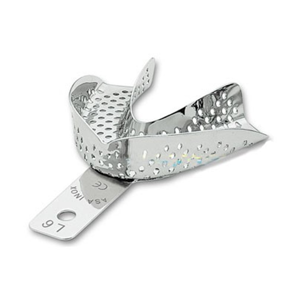 Perforated regular stainless steel impression trays without retention rim. Available in sizes XXS - U1 (61mm x 47mm) to XL - L6 (78mm x 61mm