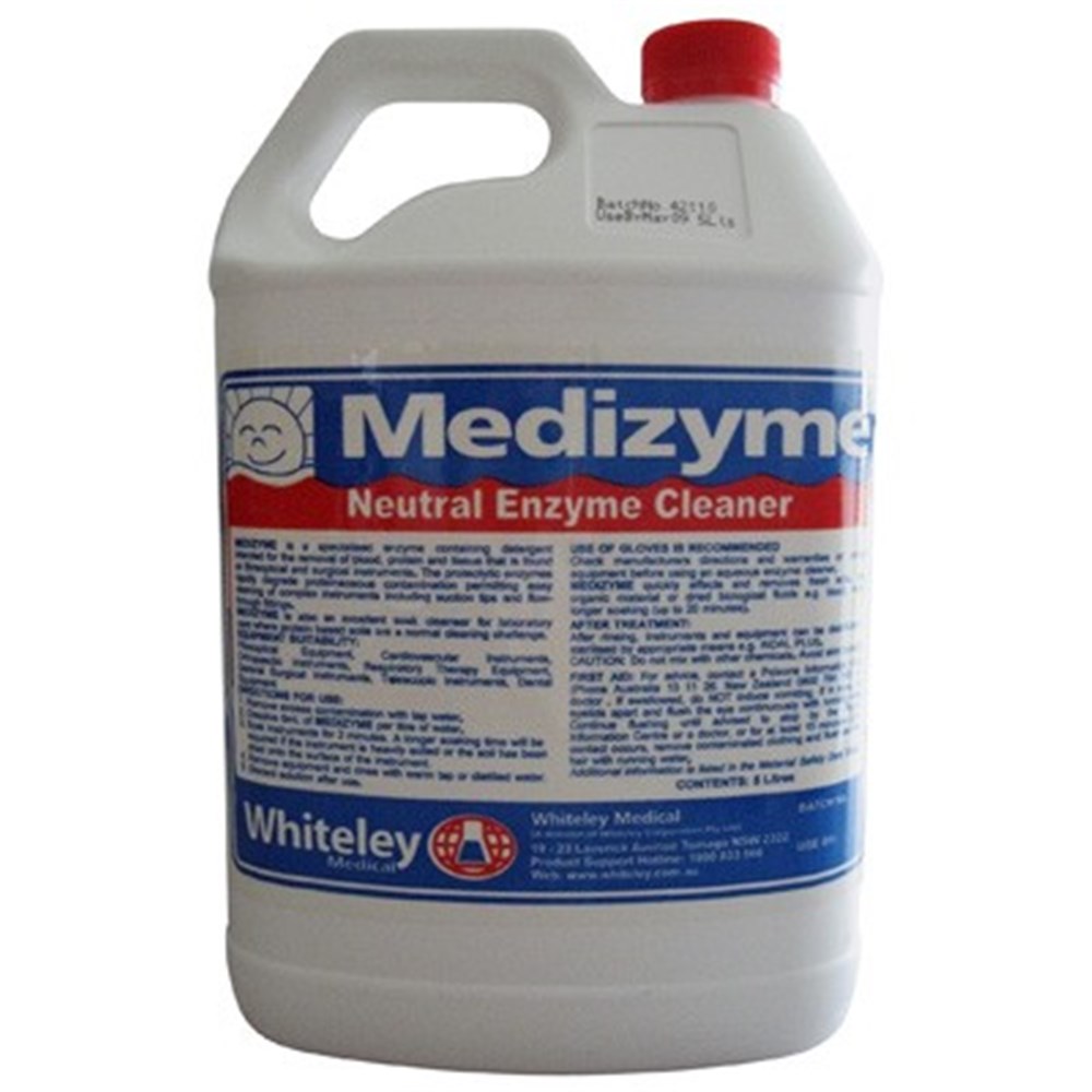 MEDIZYME is a specialised enzymatic detergent solution that is capable of removing blood and other protein deposits. MEDIZYME rapidly solubilises and disperses blood, body tissue, carbohydrates, mucopolysaccharides, lipids and other proteinaceous soils. When combined with physical cleaning, MEDIZYME provides an effective method for cleaning complex instruments. MEDIZYME is effective in hard and soft water.