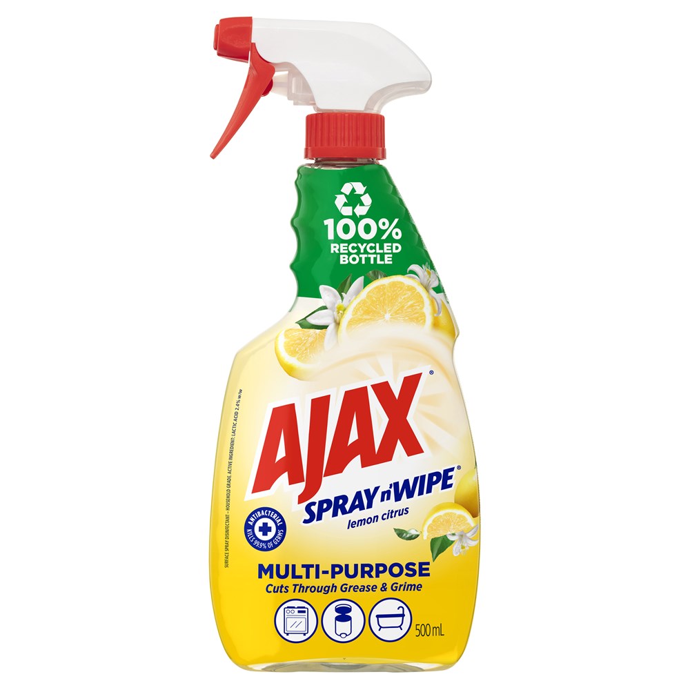 Ajax Spray n' Wipe MultiPurpose Antibacterial Disinfectant Cleaner Trigger Spray Recycled Bottle Lemon Citrus 500mL
