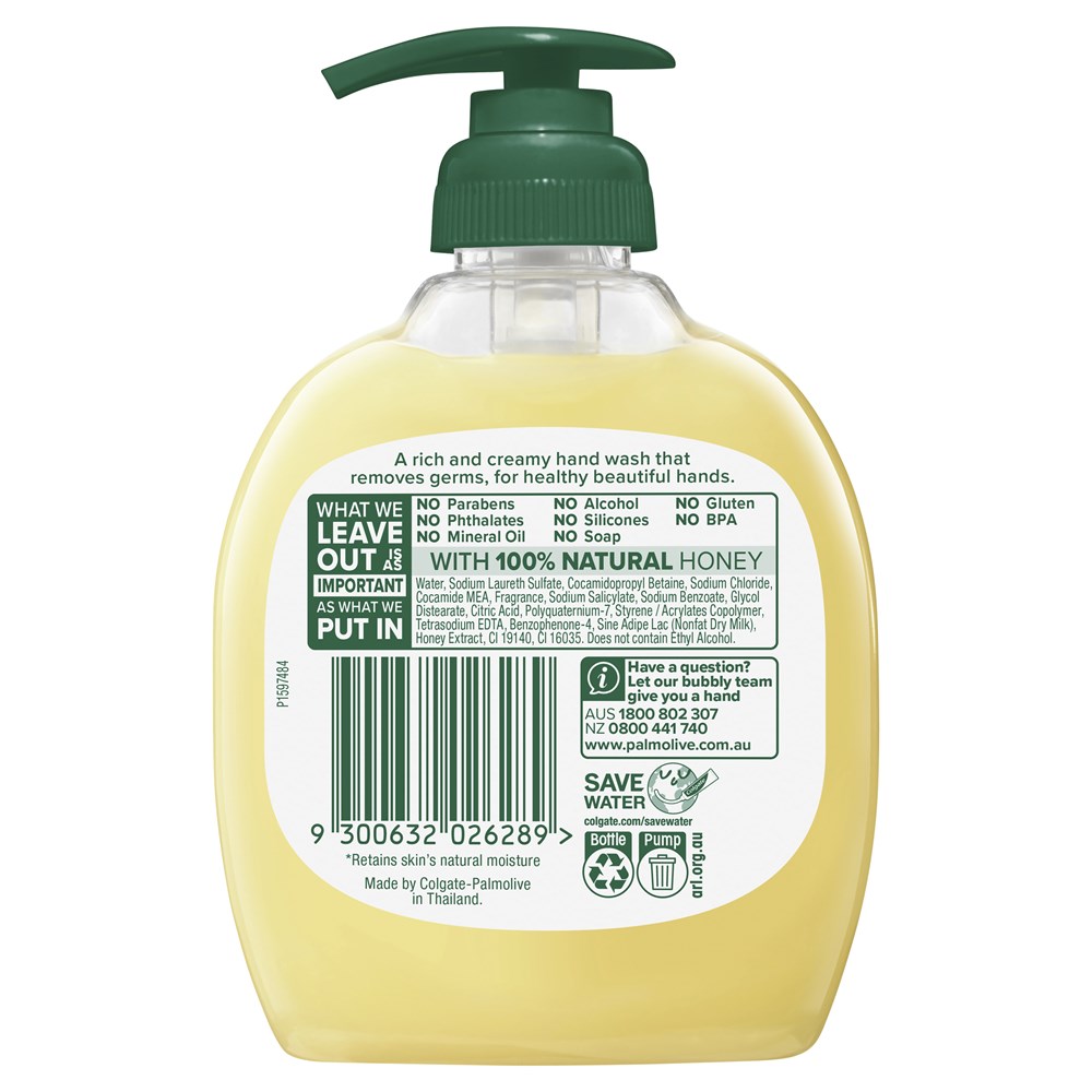 Palmolive Naturals Liquid Hand Wash Soap Milk & Honey contains 100% natural honey and moisturising milk to gently cleanse hands while retaining skins natural moisture.