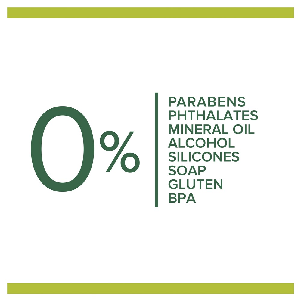 - No Parabens, No Phthalates, No Mineral Oil, No Alcohol, No Silicones, No Soap, No Gluten, No BPA, No Animal Derived Ingredients.