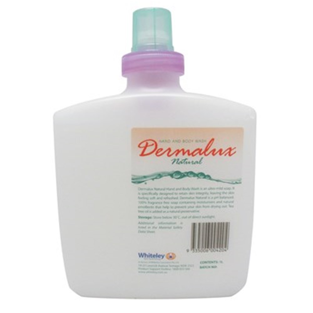 Dermalux Natural Hand and Body Wash uses Tea Tree oil as a natural preservative. Dermalux Natural is pH balanced to maintain skin integrity. The rich moisturisers and emollients contained in Dermalux Natural Hand and Body Wash leaves skin cleansed and nourished.