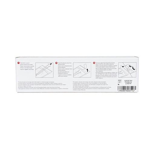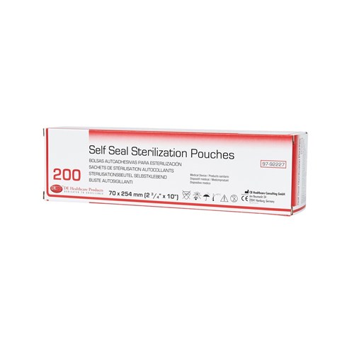 For use as packing material for medical devices in sterilization by steam, ethylene oxide gas in healthcare establishments. The Self-Sealing Sterilization Pouches are single use.