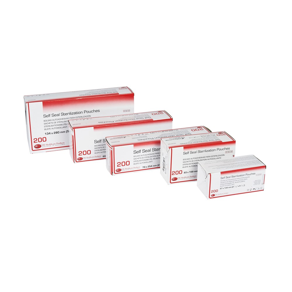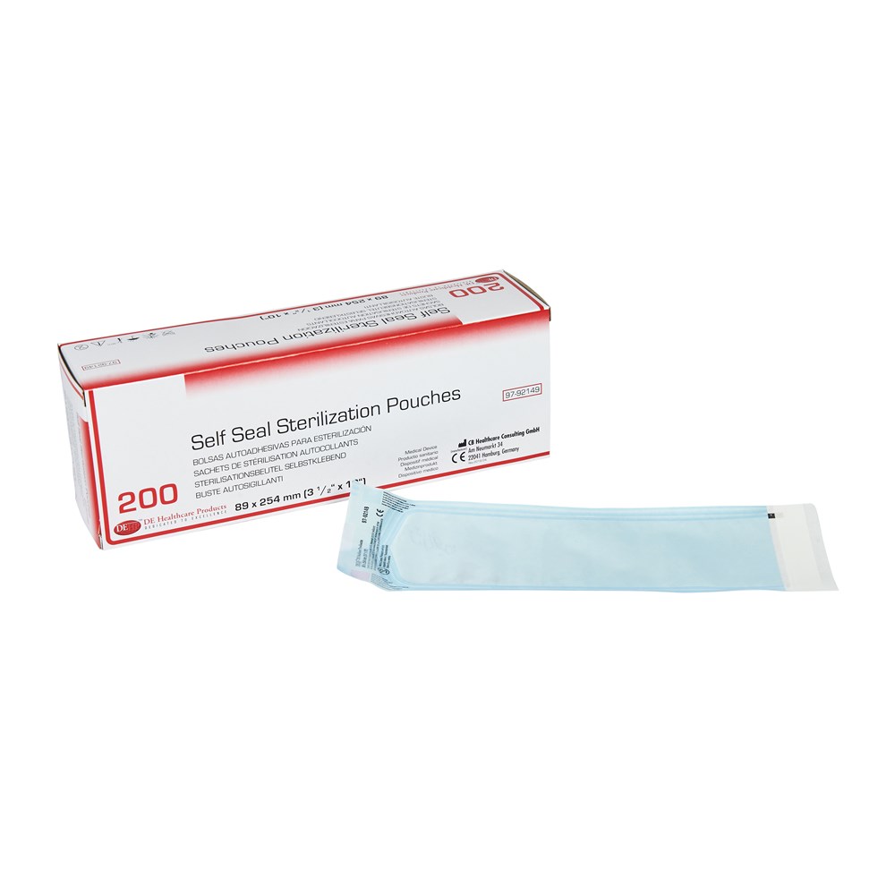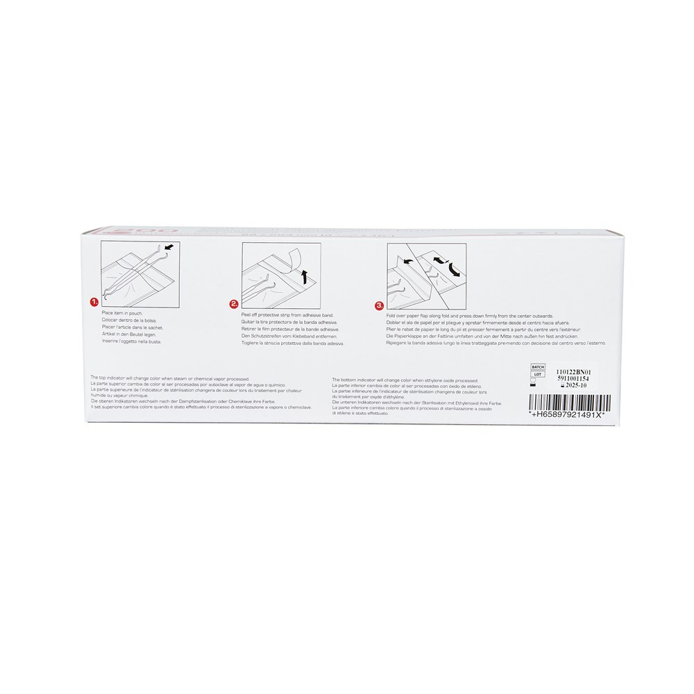 For use as packing material for medical devices in sterilization by steam, ethylene oxide gas in healthcare establishments. The Self-Sealing Sterilization Pouches are single use.