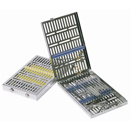 A sterilizable cassette that can hold up to 18 instruments.