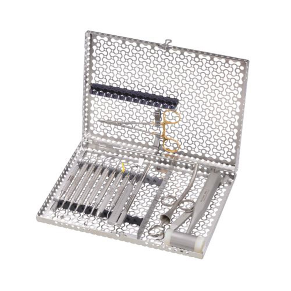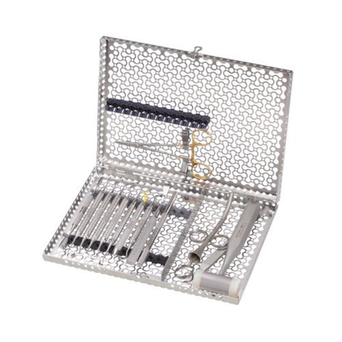 Cassette holds 12 instruments with an accessory area. Exterior Dimensions 8" x 11" x 1.25" (203 mm x 280 mm x 32 mm).