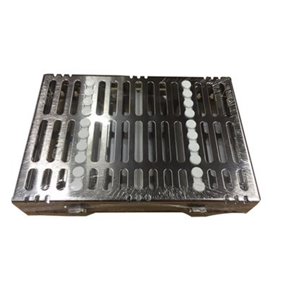 Cassette holds 10 instruments. Exterior Dimensions 5.5" x 8" x 1.25" (140 mm x 203 mm x 32 mm).