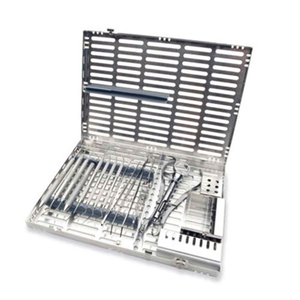 Cassette holds 12 instruments with an accessory area. Exterior Dimensions 8" x 11" x 1.25" (203 mm x 280 mm x 32 mm).