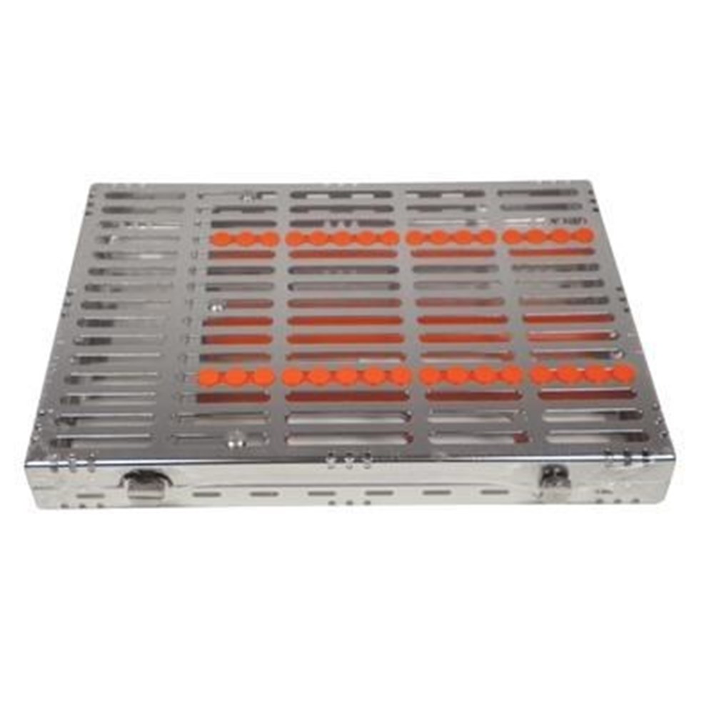 Cassette holds 16 instruments with an accessory area. Exterior Dimensions 8" x 11" x 1.25" (203 mm x 280 mm x 32 mm).