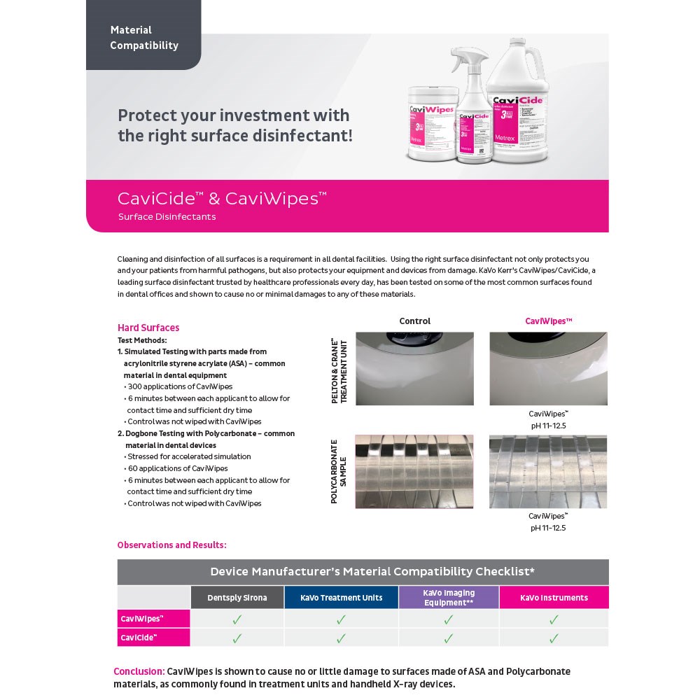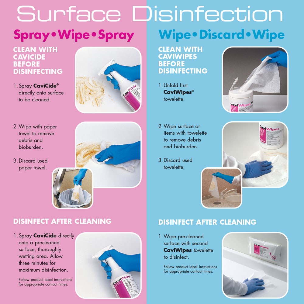 Disinfectant Wipes for Surface of Medical and Dental Devices. CaviWipes are disposable towellets pre-saturated with Cavicide Surface Disinfectant Cleaner for the effective removal of dirt and quick and broad-spectrum disinfection. They are convenient, durable, nonwoven, nonabrasive towels that won’t bunch up during use.
