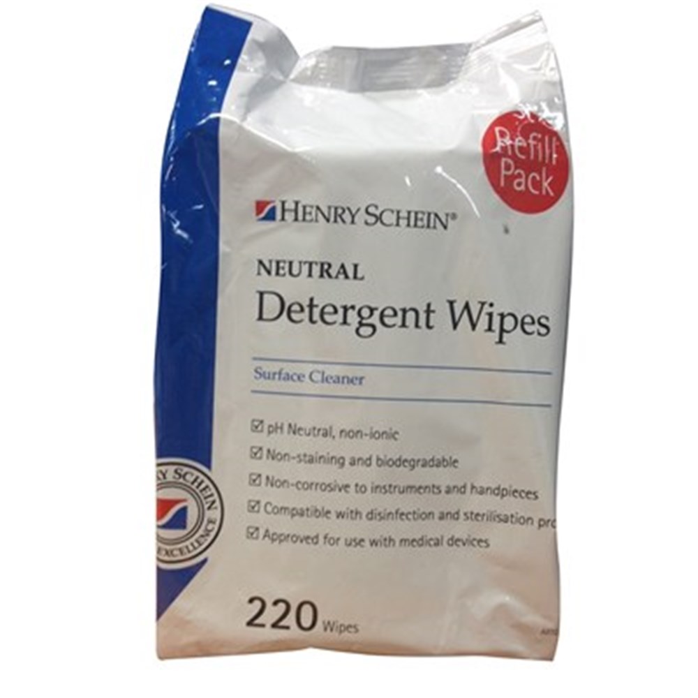 Henry Schein Neutral Detergent Wipes are a surface cleaner approved for use with medical devices. They can be used for pre-cleaning prior to disinfection or sterilisation procedures.