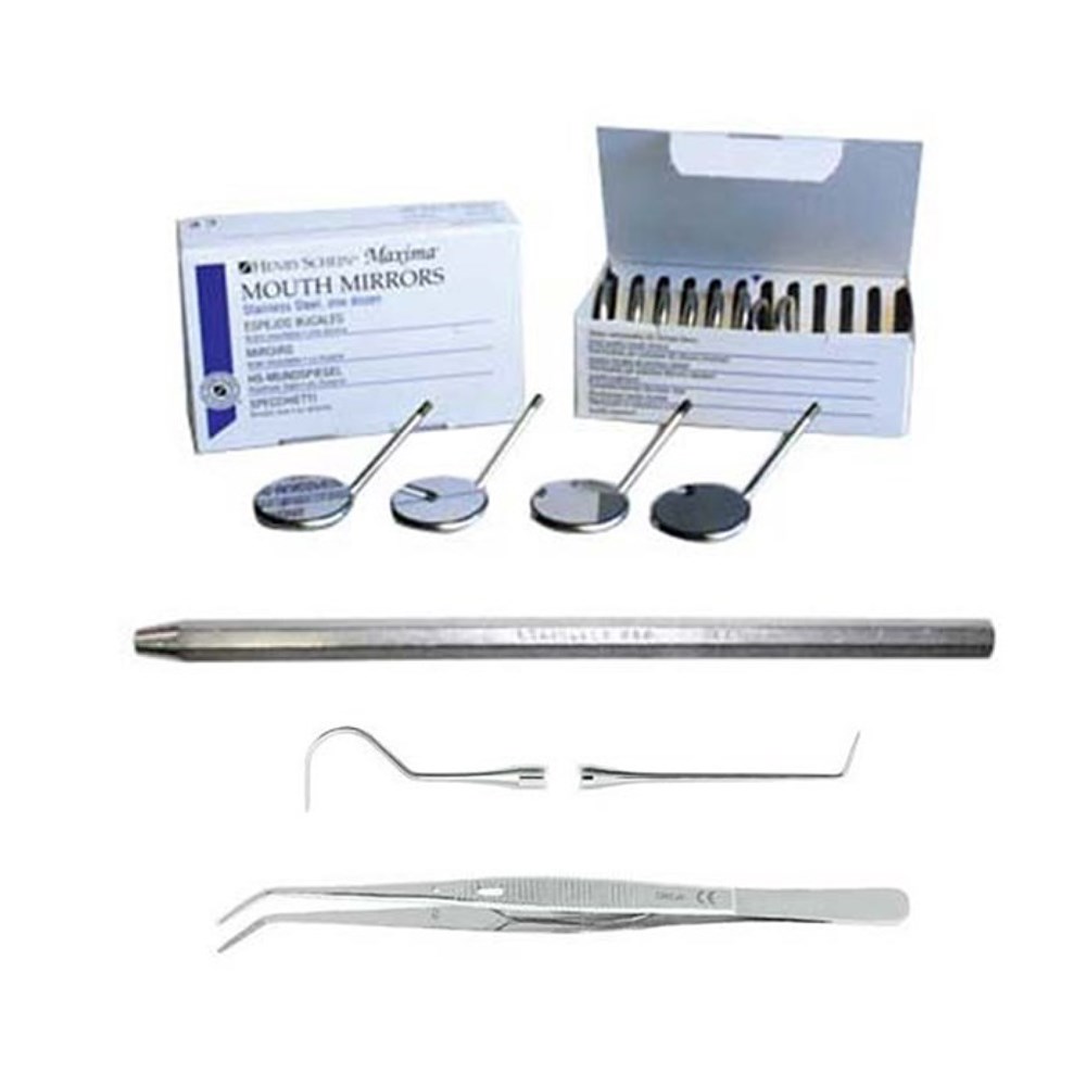 This bundle is made up of Henry Schein instruments and is the perfect solution for your general exam needs. The bundle includes college tweezers, double ended curly probes, mirror handles and mirror heads.