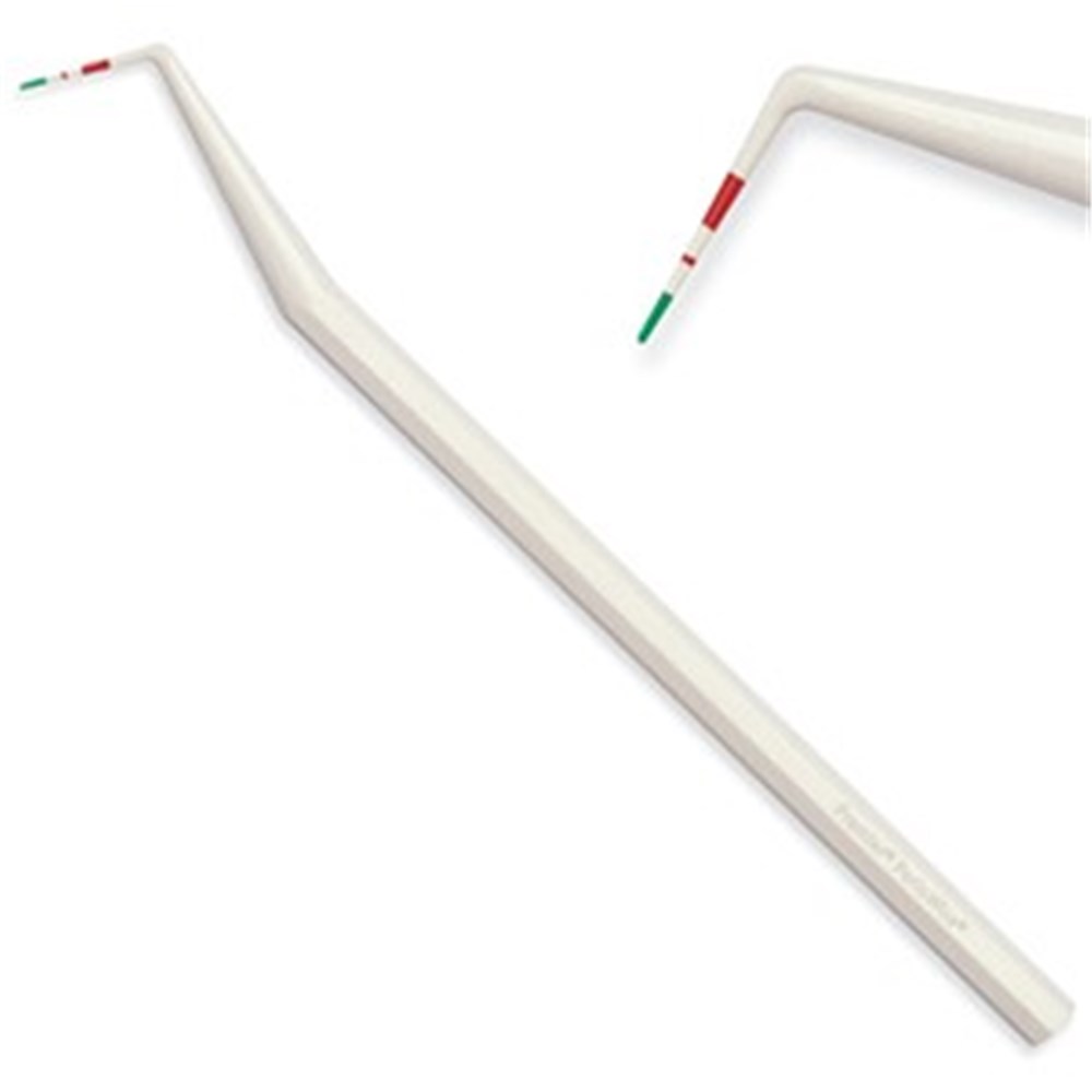 Ideal for full examination or a quick screening. Easy-to-read 3mm green band indicates periodontal health. Reaching a red mark indicates the possible presence of periodontal disease. Safe around implants. Autoclavable.
