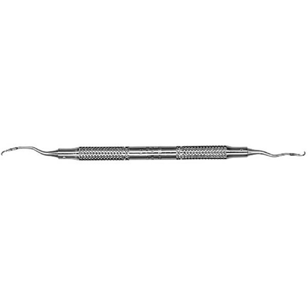 Shorter, curved blade. For mesial surfaces of molars and improved adaptation into furcations.