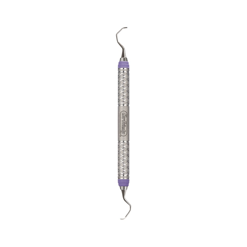 Gracey curettes, smaller blade and slightly longer terminal shank. Accentuated angle. Double-ended, easy-grip handle.
