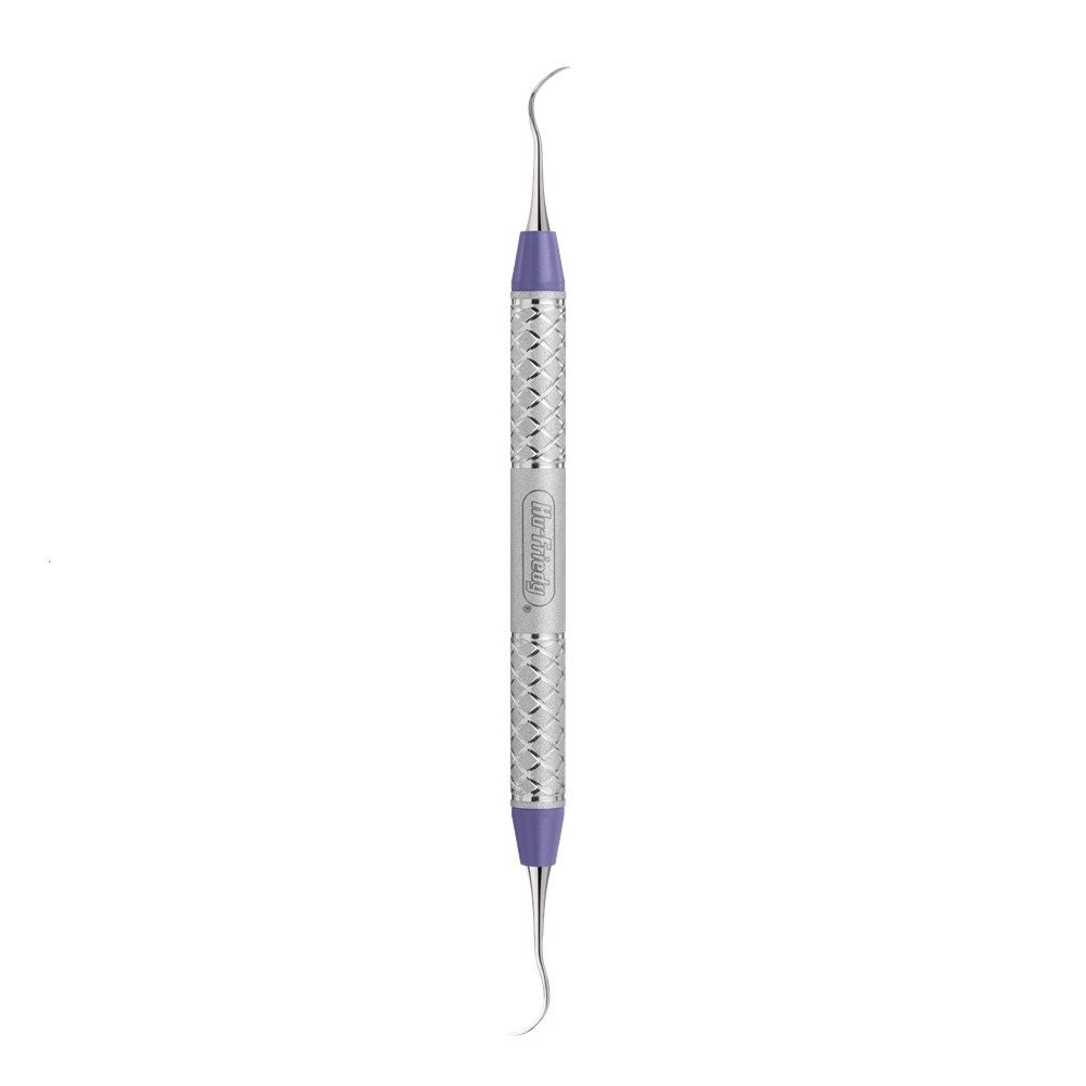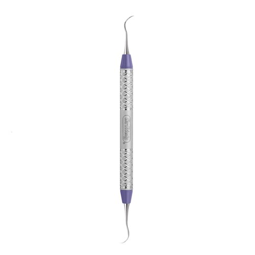 Super thin posterior curved sickle scaler. Contra-angle design. Double-ended, easy-grip handle.