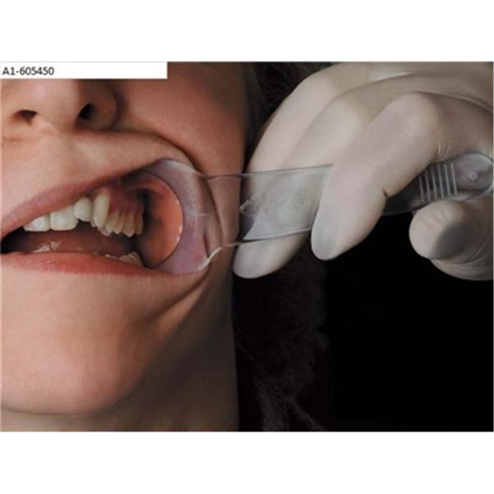 One sided cheek retractor adult size. With long handle for a free working area. Useful, e.g. for injections Photo optimized Convenient for the patient Autoclavable