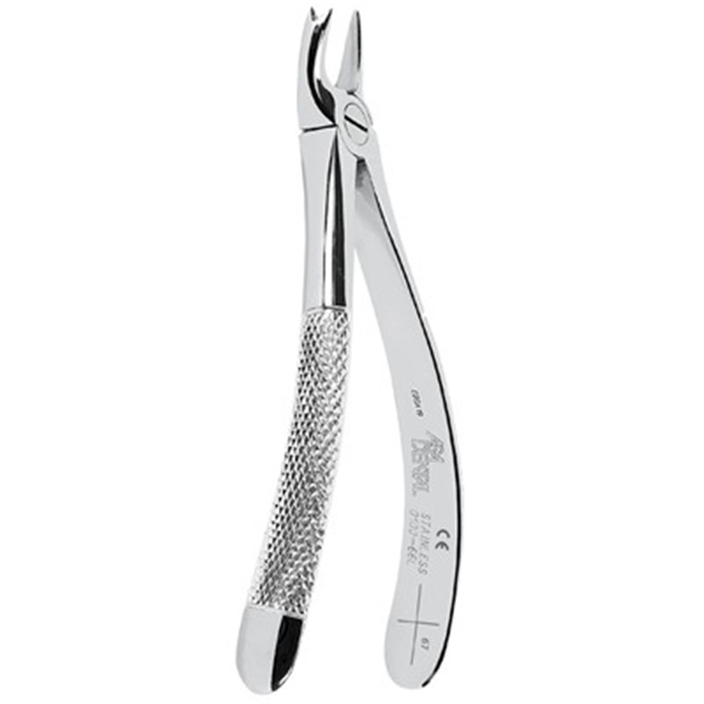 17 cm serrated extracting forceps for left upper molars.
