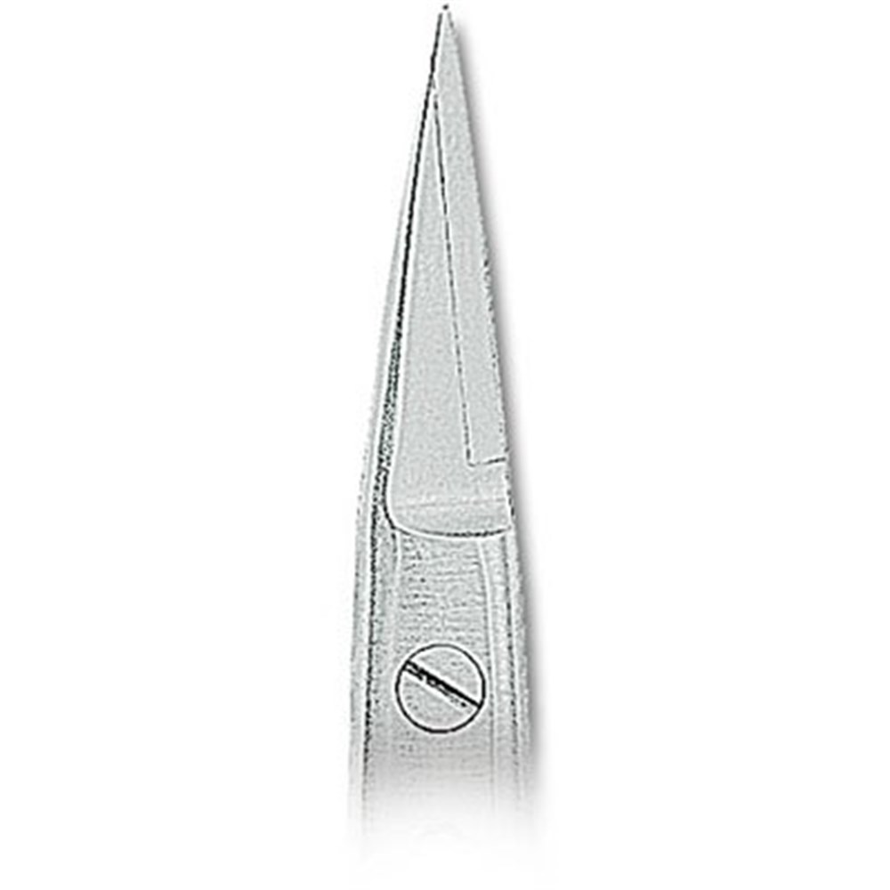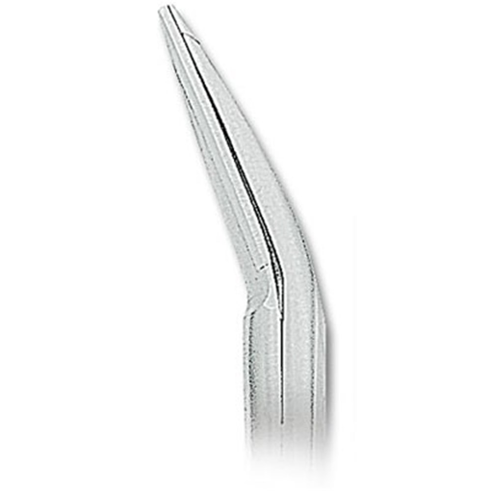 17 cm, curved, one blade serrated, gum scissors.